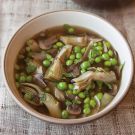 The clear broth of this soup allows the green color of the artichokes and peas to really shine. Serve this in a shallow bowl with a good loaf of bread for a light meatless meal that celebrates the arrival of spring.