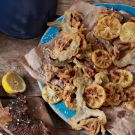Begin your meal in the Italian style with crispy morsels known as fritto misto (mixed fry). Here, we fry up fresh artichokes along with thin lemon slices, which add a refreshing tang to the mix. To ensure crisp, light results, fry the ingredients in batches so you don’t overcrowd the pot.
