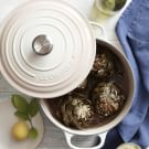 Pour the butter mixture over the artichokes, spreading the artichoke leaves apart so the butter gets between them. Drizzle the artichokes evenly with the olive oil. Cover the pot, transfer to the oven and cook until the bottoms of the artichokes are tender when pierced with a knife, about 1 hour.