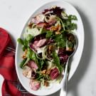 In a large bowl, combine the arugula, radicchio, beet and fennel, and season with salt and pepper. Drizzle with the olive oil and vinegar and toss to coat. Transfer the salad to a serving platter and garnish with the candied walnuts and cheese. Serve immediately. Serves 6.