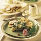 Remove from the oven and let stand for a few minutes, then cut into wedges and serve, garnished with watercress sprigs and chive blossoms.