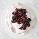 At Christmas gatherings in Australia, you’re likely to find an eye-catching pavlova adorned with colorful fruit on the table (or a “pav” as the Aussies often call it). The fruit topping for this meringue-based dessert takes well to endless variations. Here we use fresh cherries and blackberries; these fruits are at their peak in December in the Land Down Under since the seasons are the opposite of those in the Northern Hemisphere. We soak the fruit in amaretto, which imparts a sweet, nutty taste.