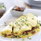Holding the handle of the pan in one hand and a serving platter in the other hand, tip the pan forward, toward the platter. Slide the filled half of the omelette onto the platter, then invert the pan to fold the omelette in half. Cut into wedges and serve immediately. Serves 6.