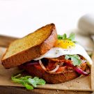 The classic bacon-and-egg breakfast just got better. Here, the ingredients are tucked between slices of brioche toast, along with sliced tomato, grilled red onion and fresh arugula. To speed preparation, the bacon and eggs are cooked simultaneously on an electric grill griddle.