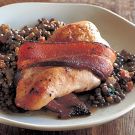 Smoky bacon transforms mild-tasting chicken breasts into a hearty fall supper. Wrapped around each chicken breast, rich, fatty bacon adds flavor and keeps the flesh deliciously moist. The bacon also complements the warm salad of tiny green Le Puy lentils that have an earthy aroma and mild peppery taste.