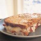 Increase the oven temperature to broil. Spread 4 of the bread slices with the mustard, then top each with 1 slice of ham and 1 Tbs. of the sauce. Cover each with one of the remaining bread slices. Spread the remaining sauce over the tops of the sandwiches, being sure to cover the edges, and sprinkle with the remaining 1/4 cup cheese.