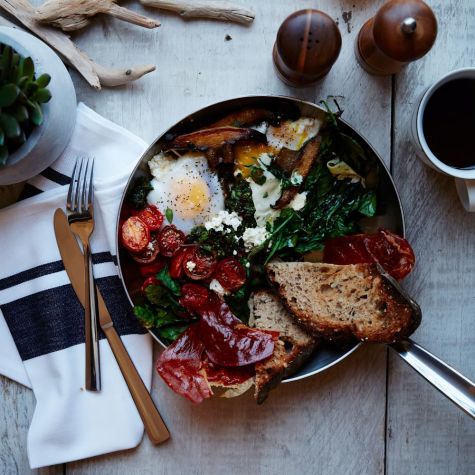 This hearty breakfast dish, the brainchild of chef Sappho Hatzis at New York City’s Bluestone Lane, has it all: eggs, vegetables, feta cheese, chimichurri sauce and prosciutto cooked to crispy perfection. When preparing the chimichurri sauce, the recipe calls for transferring the chopped herbs from the food processor to a bowl before adding the liquids; this will yield a sauce with a nice texture (you don’t want the herbs to be completely pureed). You will have some chimichurri left over; refrigerate for up to 3 days.