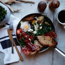 Add the mushroom and spinach to the pans with the tomatoes, dividing them evenly. Place a spoonful of the chimichurri in the middle of each pan and sprinkle the cheese on top. Carefully crack 2 eggs into each pan. Transfer to the oven and bake until the egg whites are set but the yolks still jiggle in the center when you shake the pans, 8 to 10 minutes. (The eggs will continue to cook after you remove the pans from the oven.) Sprinkle with the fresh oregano, top with the crispy prosciutto and serve immediately directly from the pans with the toast. Serves 2.