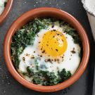Divide the chopped spinach among the prepared ramekins. Dot each with 1/2 tsp. of the remaining butter. Break an egg into each ramekin and season with salt and pepper. Drizzle each with 1 tsp. of the cream. Place the ramekins on a rimmed baking sheet.