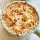 Pour the mixture into a baking dish or a gratin dish. Sprinkle evenly with the cheese and bread crumbs, then dot with the remaining 1 Tbs. butter. Bake until the cheese and bread crumbs are golden and the gratin is bubbly, 20 to 30 minutes. Remove from the oven and serve. Serves 6.