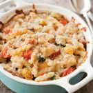 Colorful zucchini, yellow squash and cherry tomatoes nestle in this creamy pasta. Lemon zest brightens the dish, and fresh bread crumbs on top add a delightful crunch. Cut all the vegetables to about the same size to ensure that they cook evenly. Substitute other seasonal vegetables to make this recipe year-round.