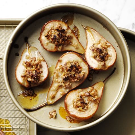 Sometimes the simplest desserts are the most sublime, and these baked pears are a great example. The heat of the oven caramelizes the fruit and concentrates the flavor, while an easy crumble topping of rolled oats, hazelnuts and maple syrup lends crunch and a hint of sweetness. We’ve used hazelnuts here, but walnuts or pecans—or a combination of your favorite nuts—will work just as well.