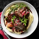 A hearty dish that’s comforting on a chilly evening, braised short ribs take a few hours to cook, but only about 30 minutes of hands-on time. Serve atop pomme puree, mashed potatoes or a bowl of softly cooked polenta, which will offset the richness of the meat. A scattering of pomegranate seeds for garnish adds a bright note and a delightful textural element.