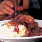 Sausages roasted until mahogany brown and served with mashed potatoes and onion gravy are a favorite in British eateries. The British sausage became known as a banger around World War I, probably because it spluttered as it fried. Along with minced pork or beef (or both), the sausages contain bread crumbs, which gives them a soft consistency and a mild flavor.