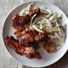 Arrange the ribs on warm individual plates and drizzle with some of the reduced sauce. Mound the slaw alongside the ribs and serve immediately. Serves 6.