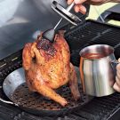 Pour the beer into the center cup of a vertical chicken roaster. Place the chicken on the roaster, with the tips of the drumsticks pointing down and away from the body. Set the roaster on the grill, away from the heat, cover the grill and cook for 30 to 40 minutes. Baste the chicken with 1/2 cup of the barbecue sauce, turn the roaster 180 degrees and cover the grill. Continue to cook until an instant-read thermometer inserted into the thickest part of the thigh, away from the bone, registers 170ºF, 30 to 40 minutes more.