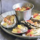 Using an oven mitt to protect your hand, remove the top shells. Spoon a little of the salsa onto each oyster, and serve with the remaining salsa alongside.