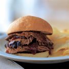 Lightly toast the rolls. Place the roll bottoms, cut side up, on individual plates and divide the brisket among them, moistening the meat on each sandwich with some of the sauce. Close the sandwiches with the tops and serve immediately. Serves 4.