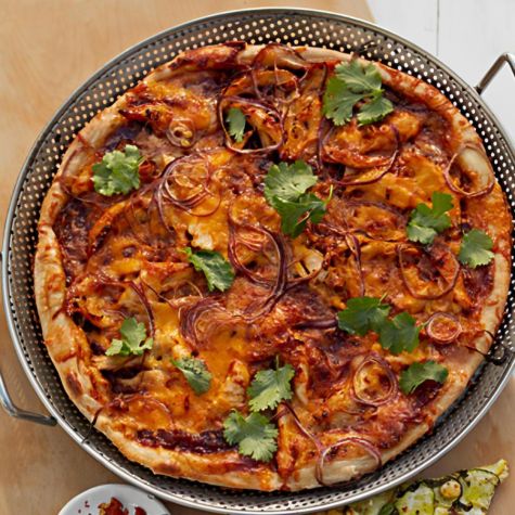Place the pizza pan in the center of the grill and cover the grill. Bake until the crust is crisp and well browned and the cheese is melted, 5 to 6 minutes. Transfer the pizza to a cutting board and top with cilantro leaves. Cut into slices and serve immediately. Makes one 12-inch pizza.