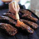 Many recipes for beef ribs grill them as a rack and cut them up before serving, but some cooks like to cut the racks into ribs and grill them individually to make them extra crispy. The mildly hot spice mixture rubbed on the ribs complements the tangy barbecue-style sauce used to coat them near the end of grilling.