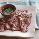 This variation on classic beef carpaccio cooks the meat following a Japanese technique, which calls for quickly searing it over high heat so that the inside remains rare. Here, beef tenderloin is roasted at a high oven temperature, allowed to cool and then flavored with a ginger-infused marinade. Generous slices of the beef are served drizzled with a bracing lemony sauce.