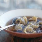 These compact pasta shapes, also called cappelletti (little hats) in some regions, each enclose a biteful of beef flavored with red wine and cheese. Boasting a small peaked top, tortellini are simpler to shape than they appear, and making them becomes easy with practice. Here, they are served in brodo, a flavorful meat broth. The recipe yields twice the amount of tortellini you will need for this primo. Plan to cook half of the tortellini and freeze the other half for later use. To cook the frozen tortellini, drop them into boiling water and cook until al dente.