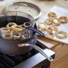 Adam Fleischman, chef/owner of the acclaimed Umami Burger restaurants in Los Angeles, gave us this recipe for crispy onion rings, which are the perfect accompaniment for his stuffed barbecue burgers. Be sure to add the onion rings one at a time to the hot oil and don’t overcrowd the pot; this will prevent the onions from sticking together as they cook.