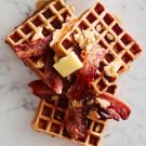 A treat any time you serve them, homemade waffles become an extravagant brunch when they are topped with thick-cut bacon and Parmesan. A drizzle of maple syrup to finish gives the dish a complex combo of sweet and salty flavors.