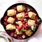 When fresh berries arrive at the farmers’ market in springtime, our Test Kitchen chefs can’t get enough of them! Here they showcase these seasonal gems in a super-simple dessert. Strawberries and raspberries are topped with a quick-to-prepare biscuit dough, then everything bakes in a cast-iron skillet to juicy perfection. Serve with dollops of whipped cream and welcome the new season. Be sure to use a light touch with the dough so your biscuits will turn out tender and flaky. And feel free to include other berries if you like, such as blackberries and blueberries.