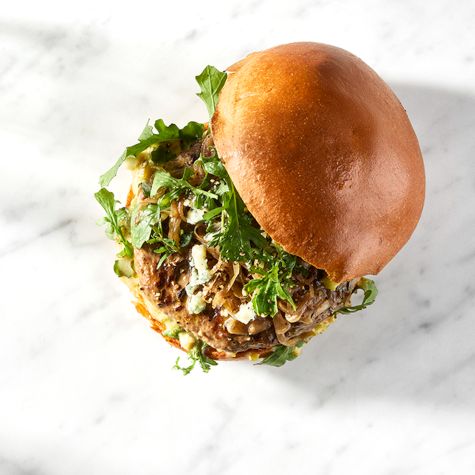 Sweet caramelized onions combine with tangy cornichon aioli and our umami-rich burger starter in this French rendition of an American classic. Avoid pre-crumbled blue cheese, which tends to be chalkier with little flavor, and opt for a French cheese freshly cut from the wheel, if you can. Roquefort and Bleu d’Auvergne bring bolder flavors and provide a bright contrast to the burger. For a milder blue cheese, look for Saint Agur or Fourme d’Ambert.
