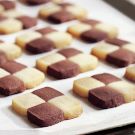 Remove the dough from the refrigerator. Using a sharp knife, cut each rectangle into 4 strips about 3/4 inch wide (you should have 4 strips of each color). Arrange 2 chocolate strips and 2 plain strips in a checkerboard pattern, brushing the beaten egg between the strips and gently pressing them together. Repeat with the remaining dough. Wrap in plastic wrap and use a knife to square off the edges of each block. Refrigerate until well chilled, about 30 minutes.