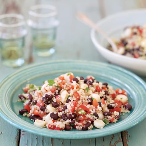 This delicious salad, very similar to Mediterranean tabbouleh, is a staple throughout the Andean region. Quinoa, one of the ancestral Inca and Chibcha Indian crops, is harvested from Colombia to Argentina in the higher Andean plains. Quinoa is prized for its earthy yet delicate flavor, as well as its nutritional value. The medley of the Peruvian corn with glossy black beans, pale gold quinoa, and red tomatoes and bell pepper make this an eye-catching and colorful salad.
