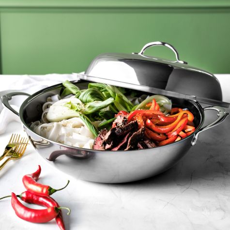 In the wok over high heat, warm the oil until shimmering. Add the bell peppers and cook, stirring occasionally, until crisp-tender, 2 to 3 minutes. Transfer to a large bowl. Add the bok choy to the wok along with more oil if needed and cook, stirring occasionally, until slightly wilted, 2 to 3 minutes. Add to the bowl with the bell peppers and cover to keep warm.