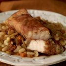 Tennessee was one of the first states to farm-raise sturgeon. The enterprise was started in order to restock rivers and lakes with the big fish that was once king, but it became clear that at least one out of ten of the farmed sturgeon should be sold, especially now that landing wild sturgeon is illegal in most states. Those who do not have the good fortune to live within cooking distance of country ham and very fresh (and legal) sturgeon could use prosciutto and grouper instead. The beans can be made well in advance of dinner; in fact, they improve with several days’ rest. Just keep in mind that they need to be soaked overnight.