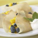 To assemble, lay a crepe flat and spoon some of the blueberries into the center of the crepe. Spoon some of the mango mixture on top and fold the crepe into quarters. Repeat with the remaining crepes and filling. Place 2 crepes on each of 4 plates, garnish with whipped cream and serve immediately.