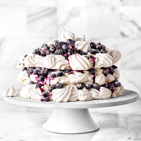 Our Test Kitchen chefs put a summery spin on pavlova, the airy baked meringue named after Russian ballerina Anna Pavlova. They transform the meringue into blossom shapes, then layer them with whipped cream, a sweet blueberry compote and fresh berries. Presented on a cake stand, this dessert makes a beautiful centerpiece for summer gatherings. You can prepare the compote up to a week in advance and bake the meringue the day before, then assemble everything just before your guests arrive. Use either small fresh blueberries or frozen berries for the compote; the chefs’ favorite is Wyman’s frozen wild Maine blueberries.