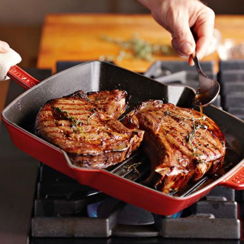 Transfer the steaks to a platter and discard the thyme sprigs. Cover loosely with aluminum foil and let rest for 5 minutes before serving. Serves 2 to 4.