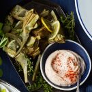 Creamy aioli spiked with mildly spicy horseradish makes the perfect accompaniment to earthy artichokes, which announce the arrival of spring when they show up at the farmers’ market. The aioli can be made up to three days in advance and stored, covered, in the refrigerator.