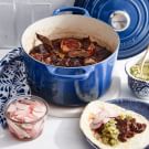 A method of preparing meat found throughout Mexico and the Caribbean, barbacoa traditionally involves cooking the meat for hours in a pit. To mimic that technique, award-winning chef Diego Galicia flavors beef cheeks with bold seasonings, including ground ancho and pasilla chiles. Then he cooks the meat low and slow in a Dutch oven until meltingly tender. Serve with warm flour tortillas and your favorite salsa for making tacos. You may need to order beef cheeks from the butcher shop in advance, so plan accordingly.