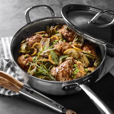 Artichokes, English peas and fresh lemon put a springtime spin on chicken thighs in this hearty braise. Serve over a plate of orzo or with slices of crusty bread for soaking up the delicious braising liquid.