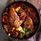 In a Dutch oven over medium-high heat, warm the olive oil. Working in batches, brown the chicken on all sides, 8 to 10 minutes per batch. Transfer the chicken to a plate and carefully pour the fat from the pot.
