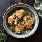 Increase the oven temperature to 400°F (200°C). Roast until the edges of the chicken skin are crisp, about 5 minutes. Transfer the chicken to a deep platter and cover loosely with aluminum foil.