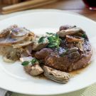 Return all the chops to the pan (you may have to stack them in 2 layers) and add the stock, wine and tomato paste. Stir with a wooden spoon to dissolve the paste and scrape up the browned bits from the pan bottom, and bring the liquid to a simmer. Reduce the heat to very low, cover the pan and simmer very gently for 30 minutes.