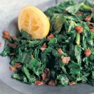 Transfer the greens to a warmed serving dish. If there is cooking liquid left in the pan, simmer until it is syrupy and reduces to about 1 Tbs. Pour the liquid over the greens and toss to combine. Taste and adjust the seasonings, then squeeze the juice from the lemon half over the greens. Top with the crisp pancetta and serve immediately. Serves 4.