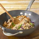 Increase the heat to high and add the remaining 1 Tbs. oil to the wok. Add the carrot and cabbage, and toss and stir until beginning to wilt. Add the garlic chives and toss and stir for 10 seconds. Remove from the heat and add to the chicken mixture.