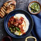 Red pepper flakes bring the heat to our spicy Italian tomato sauce, which is used to braise pork shoulder until it is meltingly tender. To add even more complexity, feel free to toss in a Parmesan cheese rind along with the tomatoes. And, if you happen to have Calabrian chiles in oil in your pantry, add a few teaspoons along with the garlic and reduce the quantity of red pepper flakes to 1/2 tsp. for even more complex flavor. Serve the braised pork on top of a mound of polenta made from semolina flour, which cooks much more quickly than the traditional version made with coarsely ground corn meal. A spoonful of tapenade made from briny green olives and capers adds bright flavor to the finished dish.