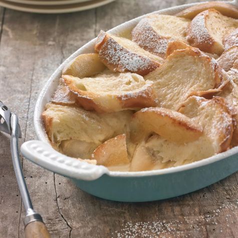 This indulgent breakfast, a sort of composed version of French toast, features layers of buttered bread baked into an eggy custard atop a hidden layer of cinnamon-spiced pears. This simple, comforting dish is easy to embellish with other fruits such as apples, peaches or nectarines.