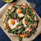 Featuring San Marzano tomato sauce, mozzarella cheese, sliced prosciutto and eggs, this pizza is a hearty and satisfying dish to serve for brunch. A tangle of lightly dressed arugula adds a fresh finishing touch.