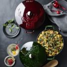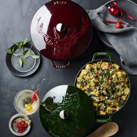 In a large bowl, toss together the bread cubes, the caramelized onion, spinach, ham and cheese. Transfer to the Dutch oven. In a bowl, beat together the eggs, half-and-half, 1 tsp. salt, and pepper to taste. Pour over the bread mixture. Cover with plastic wrap and refrigerate for at least 2 hours or up to 16 hours.