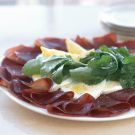 Bresaola, which originated in the mountains of Lombardy, is made by salting beef and allowing it to air-dry for several weeks. It is leaner than prosciutto, which is cured in much the same way, and has a sweet aroma and rich flavor. It is popularly offered as an antipasto, thinly sliced in the manner of carpaccio and served with similar accompaniments. This recipe also makes a satisfying main course in summer. Franciacorta, a sparkling wine from Lombardy, pairs well with the dish.